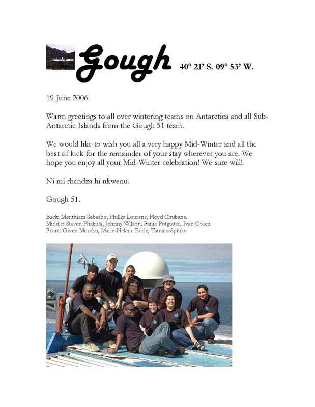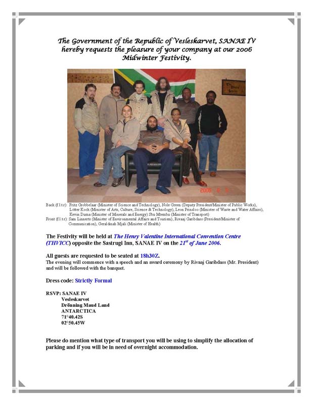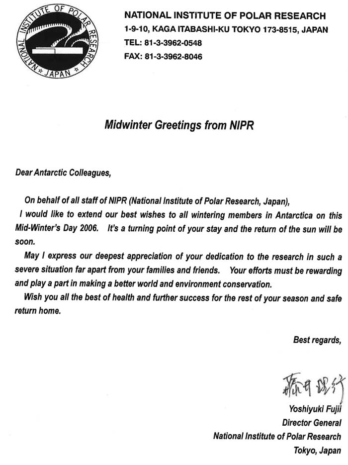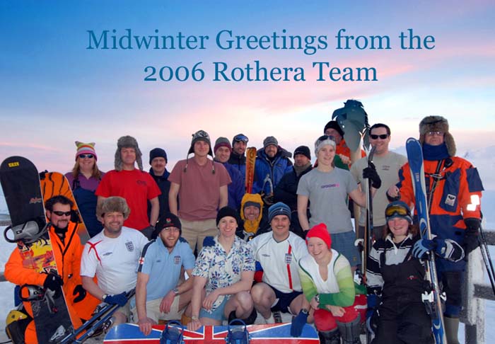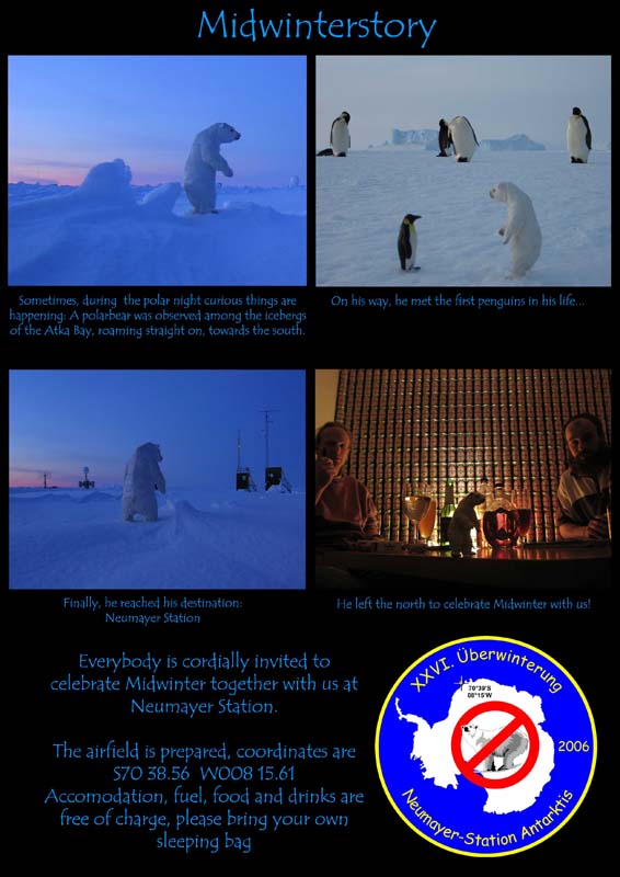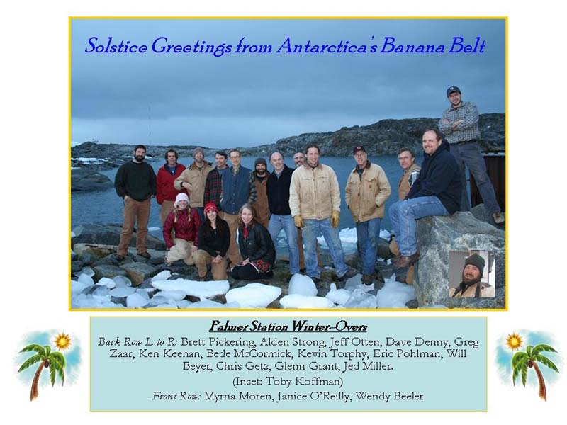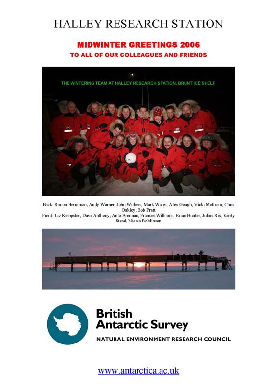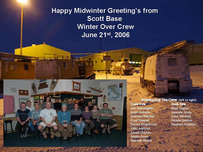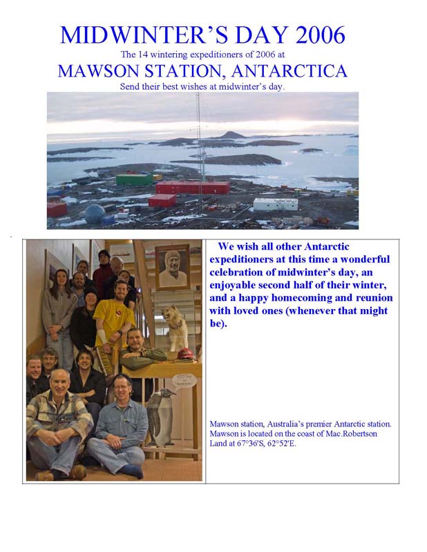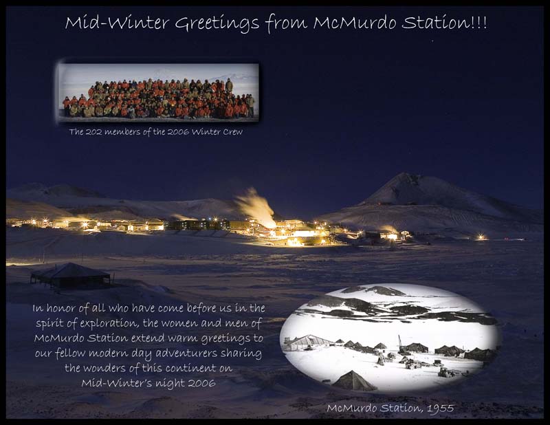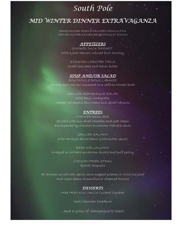 Greetings from McMurdo Station, The Winter-overs of McMurdo would like to extend a warm greeting to all other Antarctic stations and everyone below 60 South. May you all have a festive Mid-Winter celebration and enjoy the remainder of your Austral winter. Even though many of us are separated by vast distance we are brought together by the experience of sharing this winter season in Antarctica. For the rest of you on the other side of the equator we hope you are enjoying the beginning of summer. We will be celebrating our Mid-Winter dinner on June 17th this year, a couple of days prior to Winter Solstice. If you are in the area we invite you to drop in and share our dinner. No reservations are required, but please dress semi-formally. For those interested I've attached a menu and our Mid-Winter greeting card. Best wishes, William Henriksen, NSF Station Manager, McMurdo (USA) e-mail nsfstmgr@usap.gov |