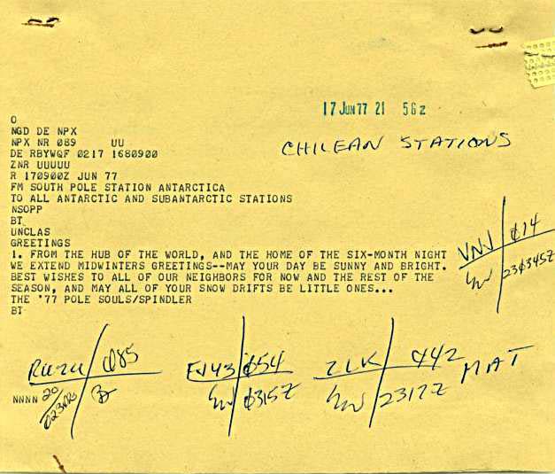 This was a mid winter greeting sent from South Pole Station in 1977. There was no such thing as a JPEG back then. Notice the punch tape attached in the top right corner? I used to send the same communications from Mazatlan to Goddard back in 1991. Photo compliments of Bill Spindler |